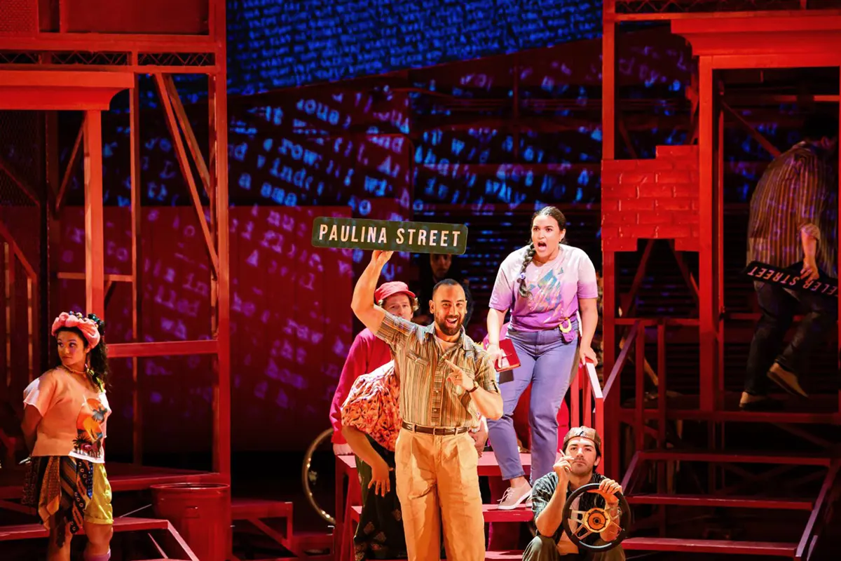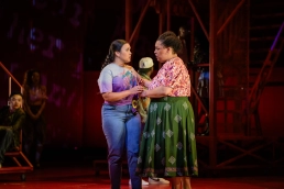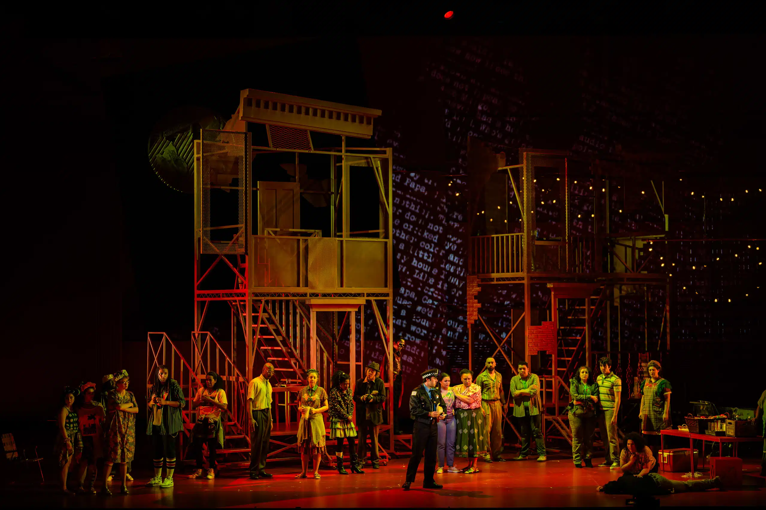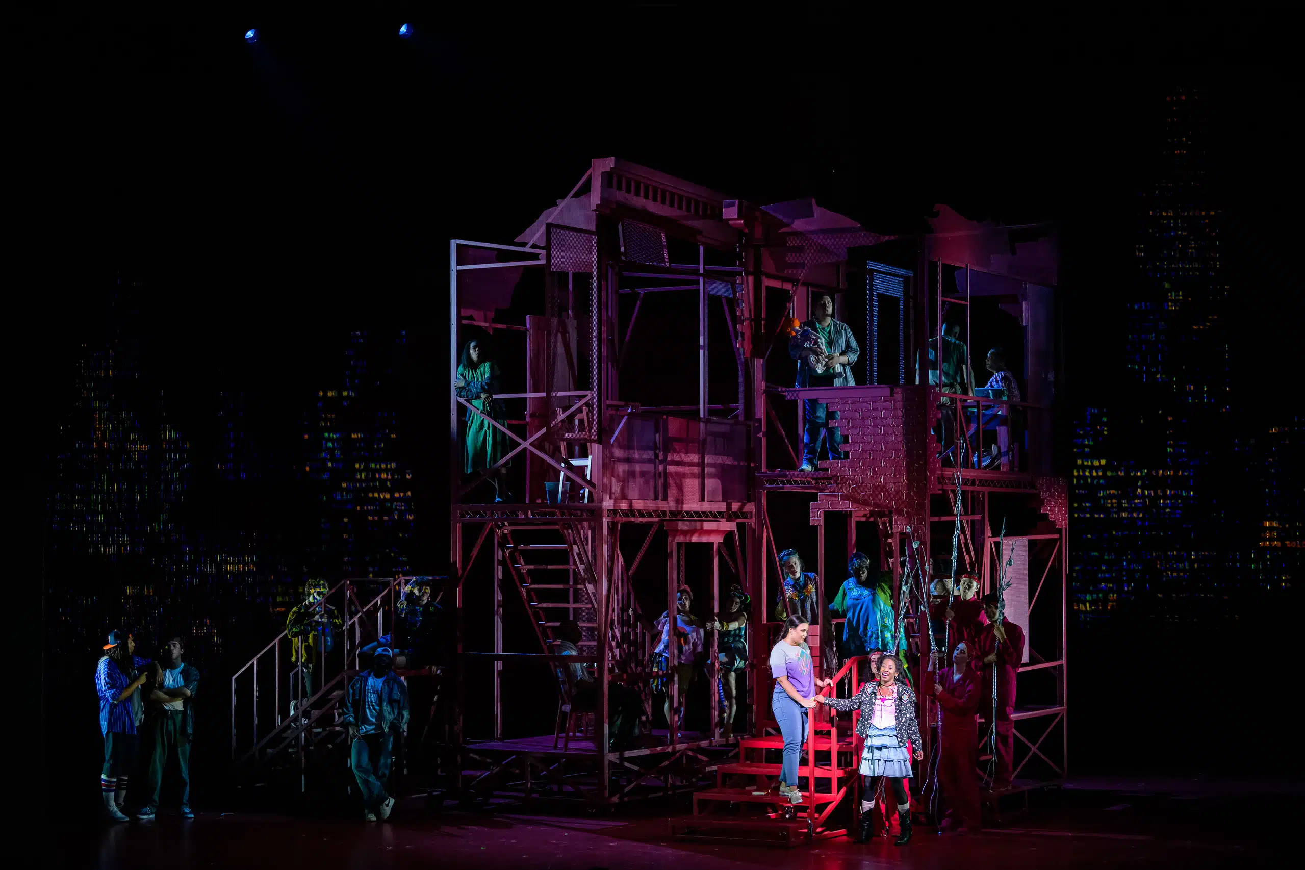 “…The House on Mango Street. Three-story bright red scaffolding units served as fire escapes of an urban universe defined by one neighborhood block. Wheeled in and out as needed, the set pieces also provided surfaces for colorful projections including sequined bespangled events as you might find spilling out across a crowded street during a Hispanic street festival. Visual elements also include gigantes, the giant Mexican puppets, mixing realistic street scenes with pure theatrical magic”.