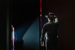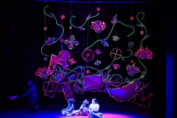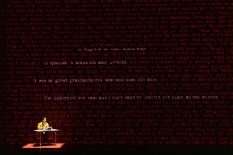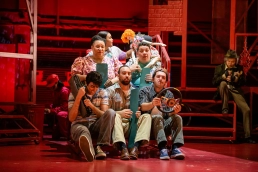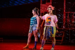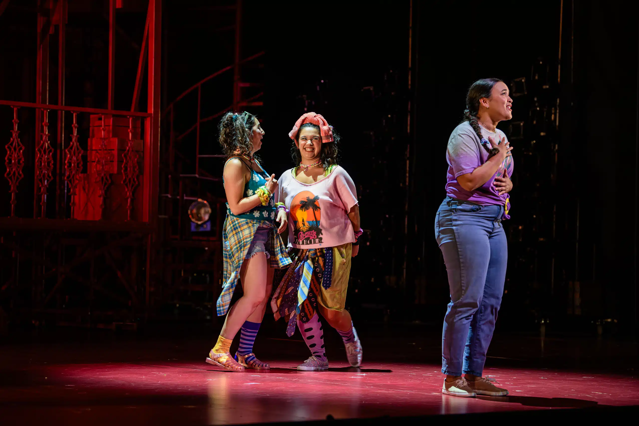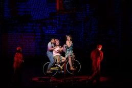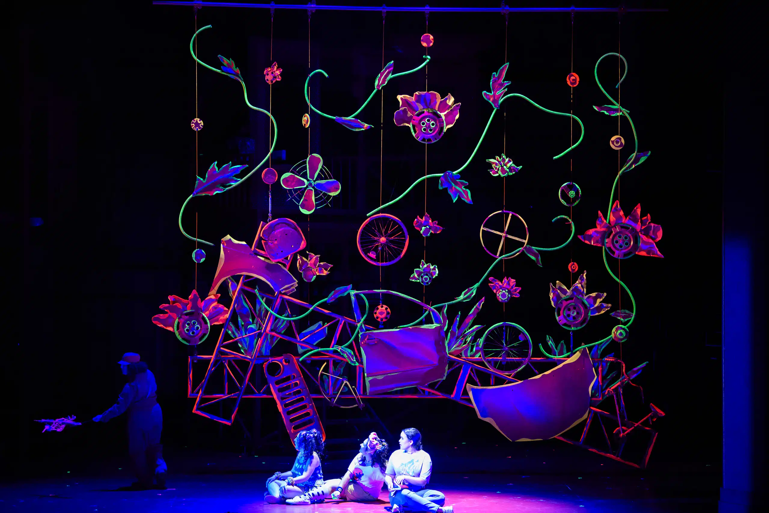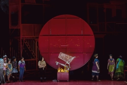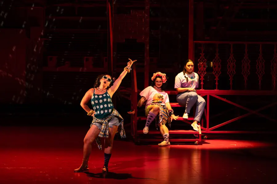 “…The House on Mango Street. Three-story bright red scaffolding units served as fire escapes of an urban universe defined by one neighborhood block. Wheeled in and out as needed, the set pieces also provided surfaces for colorful projections including sequined bespangled events as you might find spilling out across a crowded street during a Hispanic street festival. Visual elements also include gigantes, the giant Mexican puppets, mixing realistic street scenes with pure theatrical magic”.